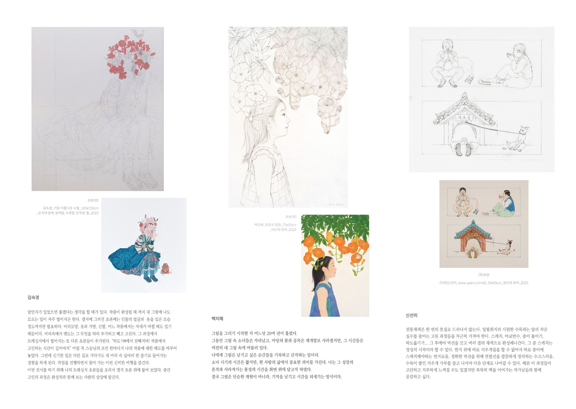 각자의 작업에서 초본의 의미는 무엇이며, 이어지는 채색화 작업과 완성된 작품이 되기까지의 과정을 전시를 통해 보여줍니다.