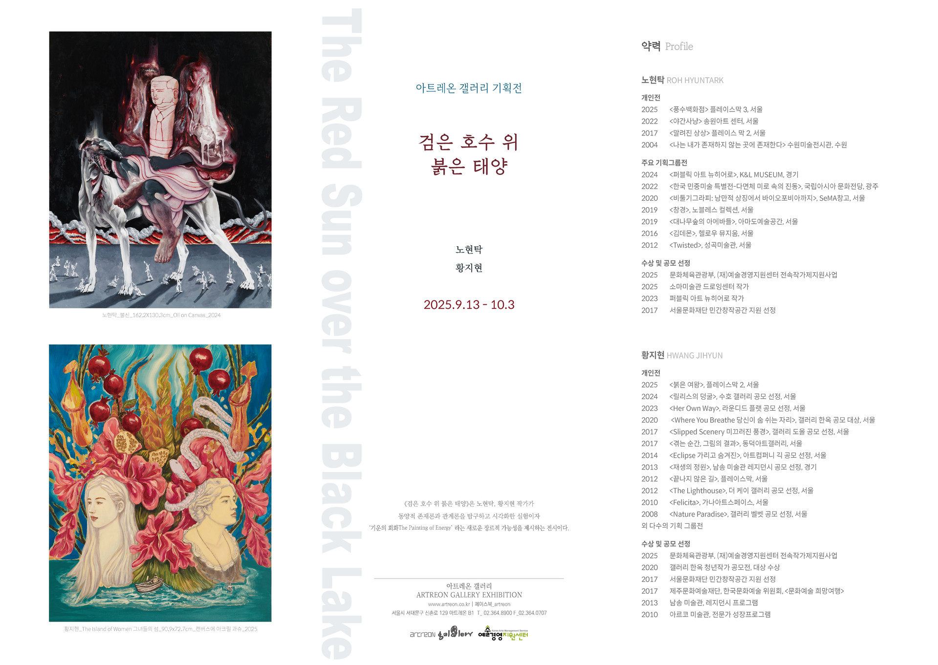 〈검은 호수 위 붉은 태양〉은 작가 황지현과 노현탁이 공유하는 명리학 존재론을 회화적 구조로 전환한 공동 프로젝트로서 이들은 각각 불(火)과 물(水)의 기운을 상징하는 사주적 특징을 회화 조형 방식에 대입하여 상이한 감각적 리듬과 조형적 태도로 탐색한다. 전시 제목 ‘검은 호수 위 붉은 태양’은 노현탁과 황지현 두 작가가 구축하는 세계의 심층과 발화를 하나의 장면으로 엮는다.