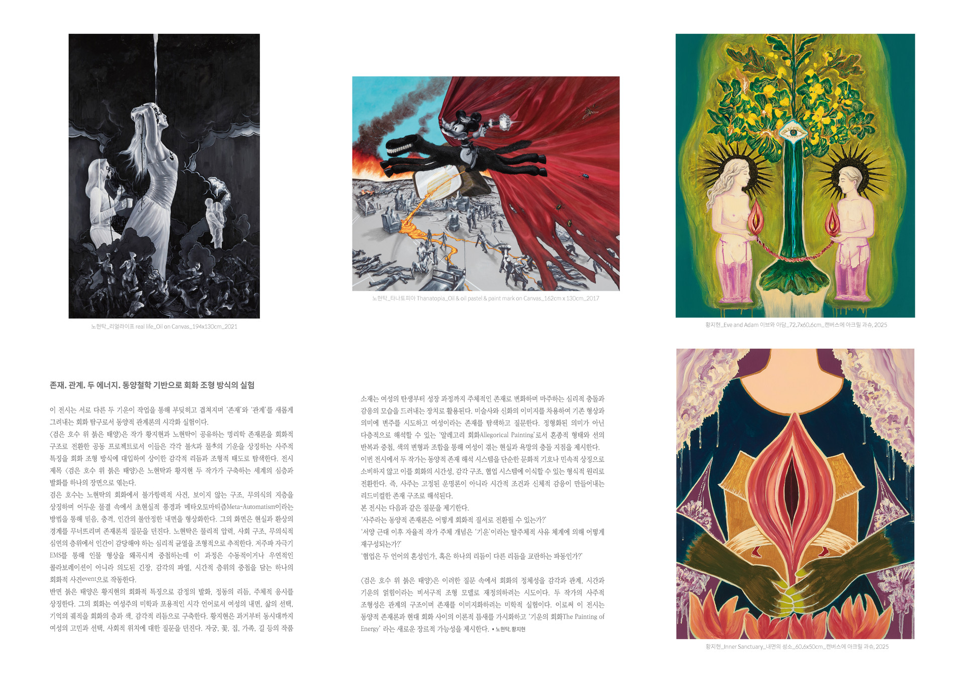 〈검은 호수 위 붉은 태양〉은 이러한 질문 속에서 회화의 정체성을 감각과 관계, 시간과 기운의 얽힘이라는 비서구적 조형 모델로 재정의하려는 시도이다. 두 작가의 사주적 조형성은 관계의 구조이며 존재를 이미지화하려는 미학적 실험이다. 이로써 이 전시는 동양적 존재론과 현대 회화 사이의 이론적 틈새를 가시화하고 ‘기운의 회화’(The Painting of Energy)’ 라는 새로운 장르적 가능성을 제시한다.